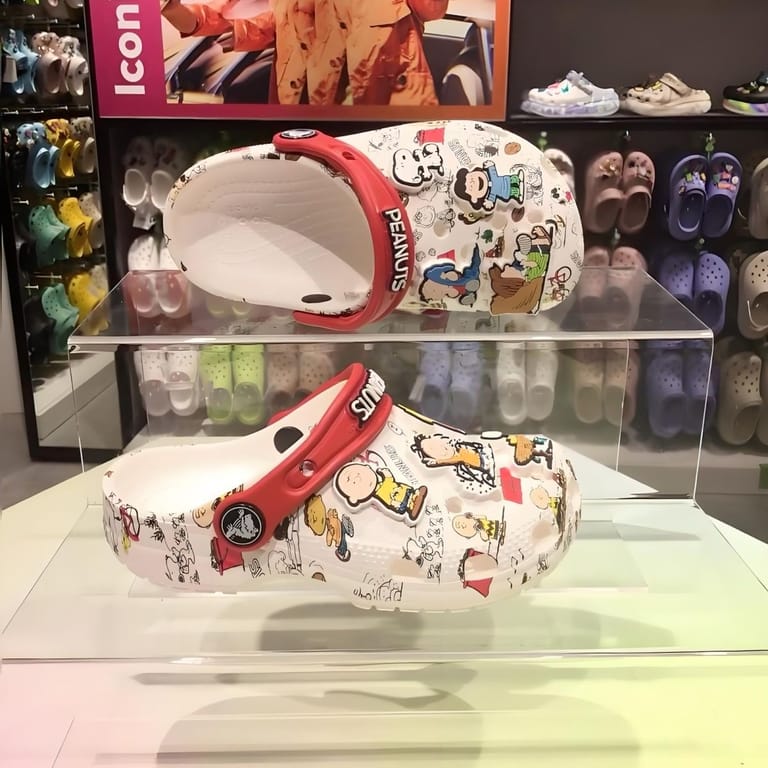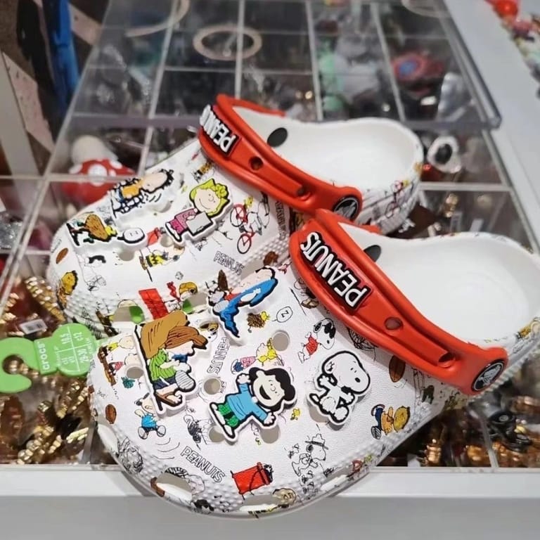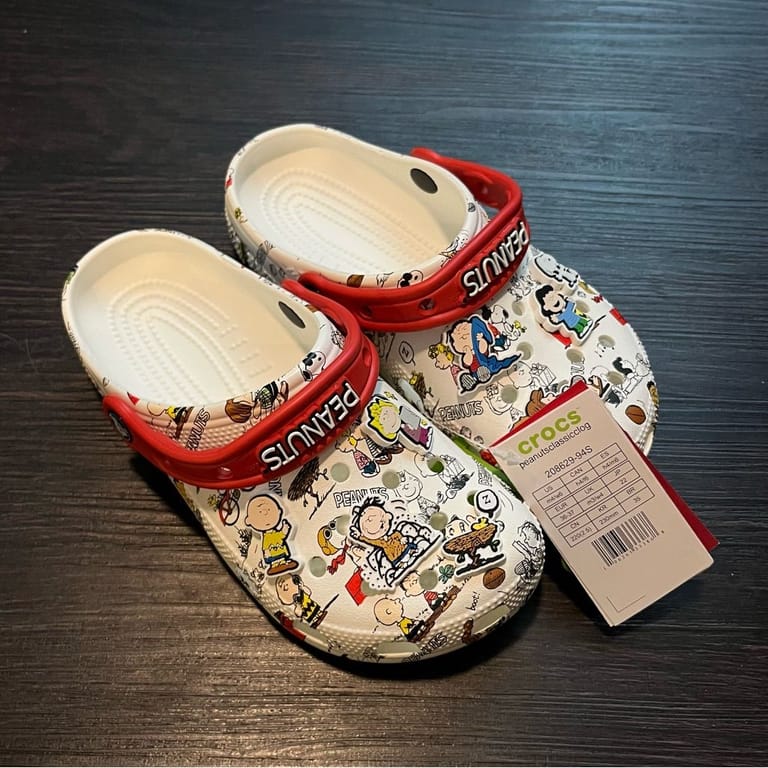 Step into fun and comfort with our Peanuts Cartoon Clogs! These slip-on clogs are adorned with vibrant images of beloved Peanuts characters like Snoopy, Charlie Brown, and more, making them a must-have for fans of the classic comic strip. Featuring adjustable red straps for a customized and secure fit, these clogs are perfect for everyday casual wear, lounging, or showing off your love for Peanuts. Available in a range of sizes for Kids, toddlers and adults, their lightweight design and cushioned sole ensure all-day comfort. Add a pop of playful color to your wardrobe with these stylish and durable Peanuts Cartoon Clogs, ideal for gifting or treating yourself.