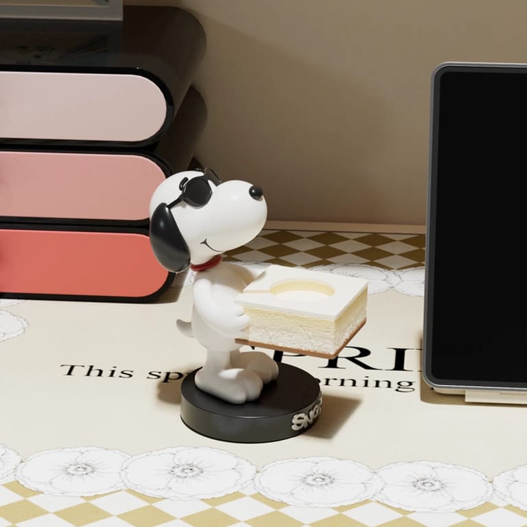Design: Snoopy with sunglasses holding a cake-shaped charging tray
