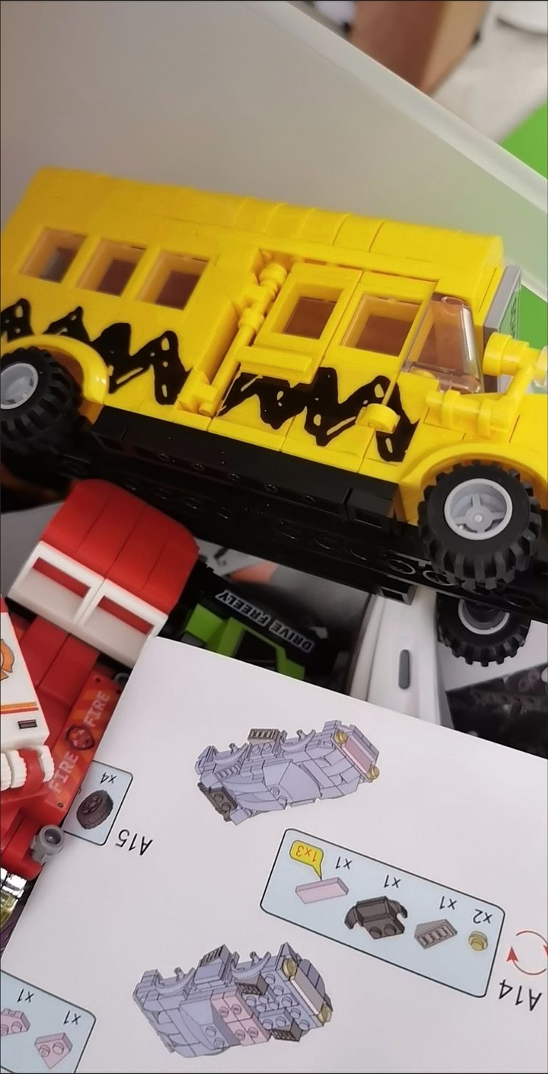 Model Details: Item NO.5017 – Assemble a detailed school bus with windows, wheels, headlights, and a "School Bus" sign for realistic fun.